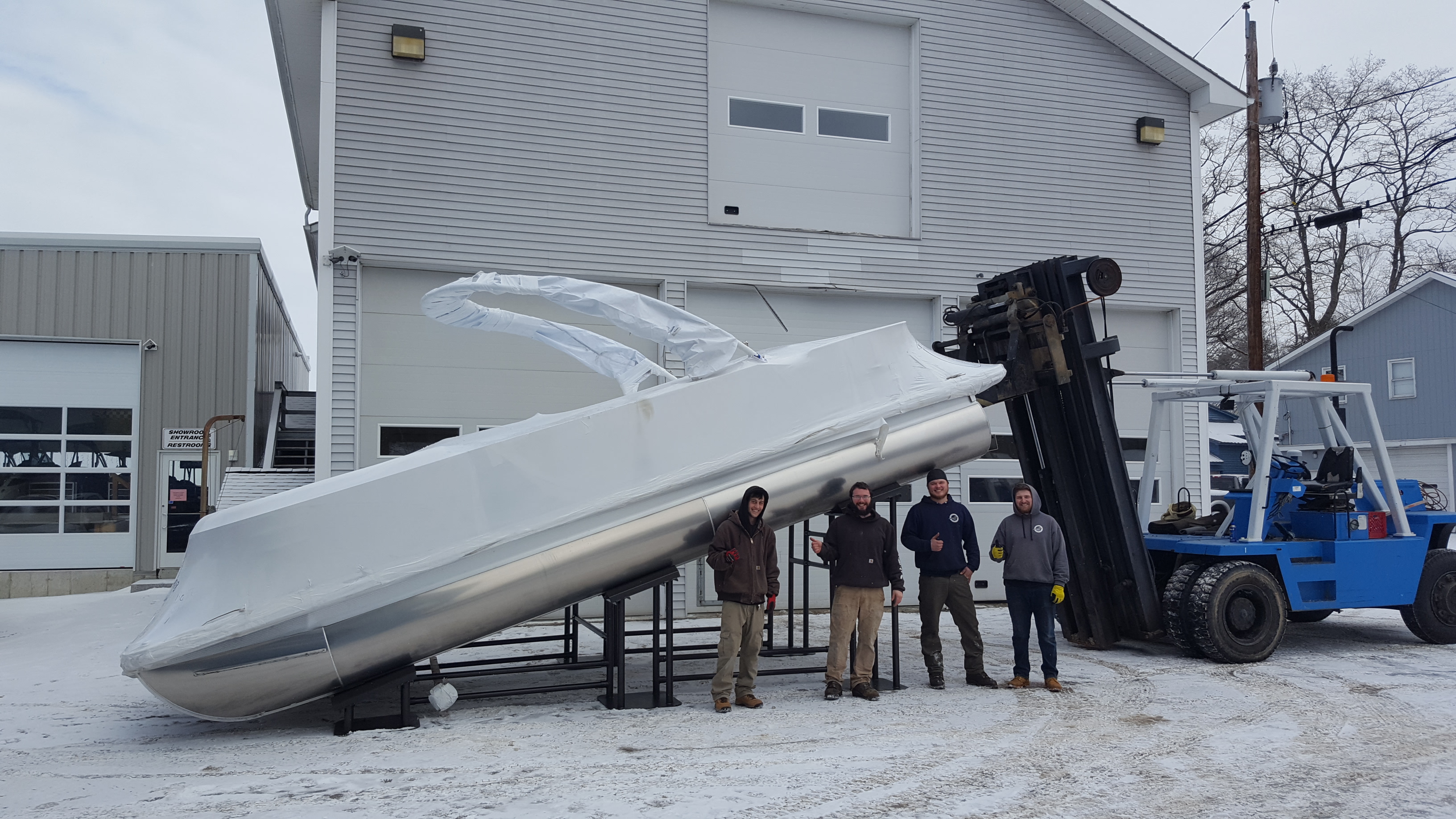 02-06-18 The service crew is testing out the fit of a big Bennington Pontoon on our custom display rack. See this too in Boston next weekend.