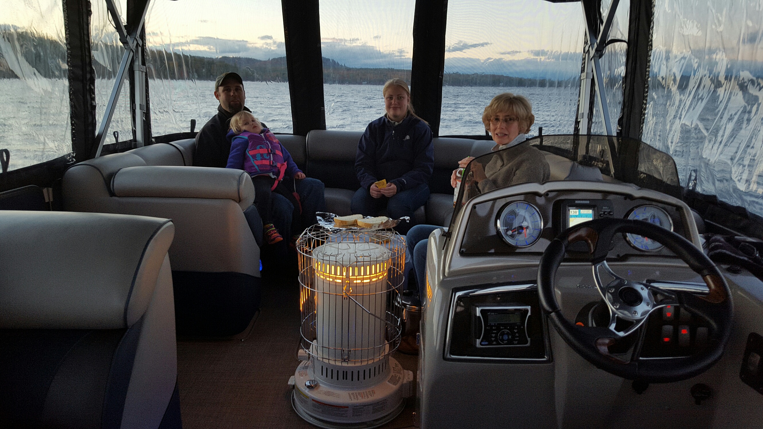10-17-15 39F 7pm Out for our first late season boat cruise with our buddy the kerosene heater. Nice and toasty. A great way to enjoy a few last boat rides…