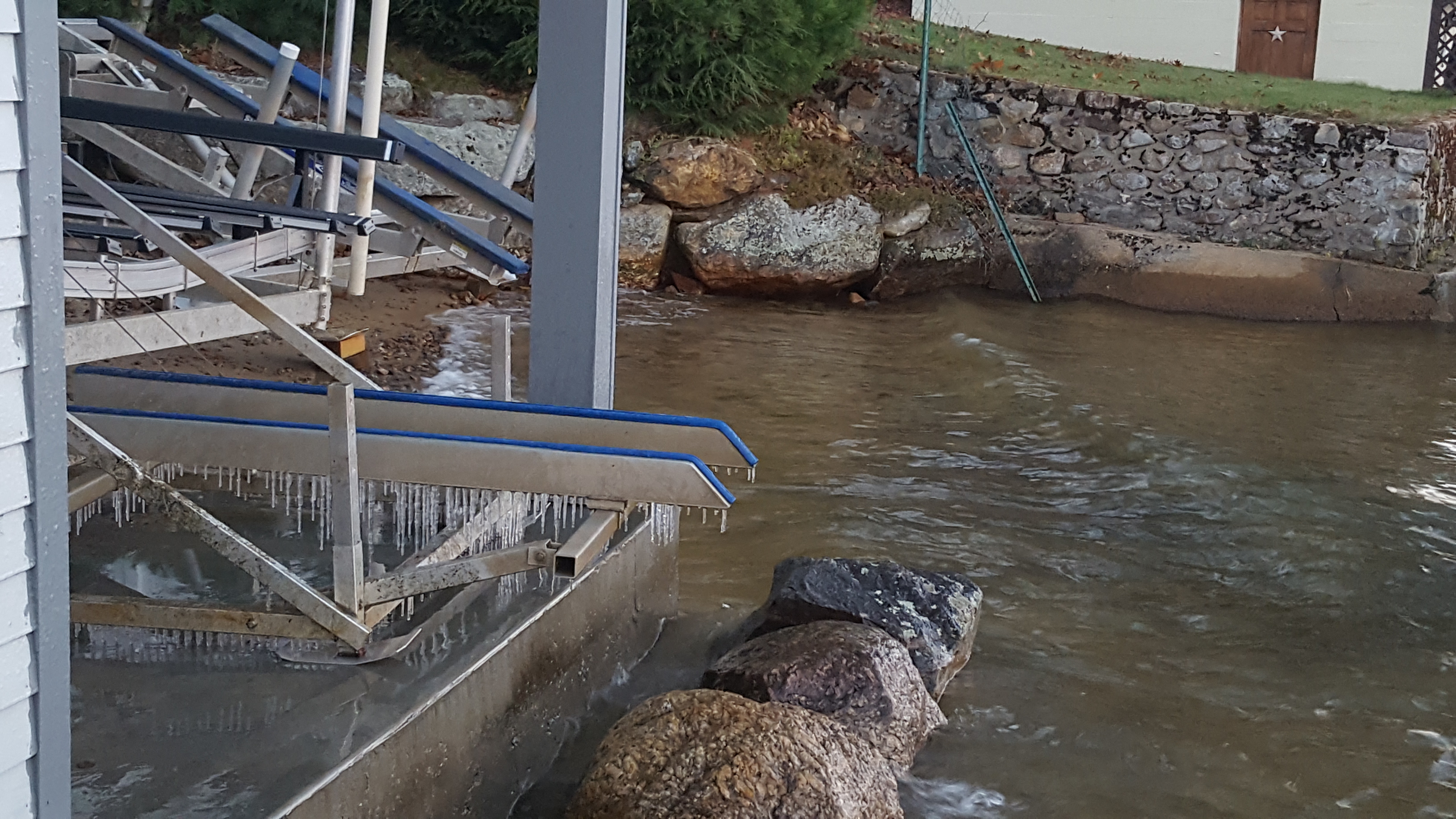 The lakes are high because of all the rain lately. So with the wind and the waves there is lots of ice around the waterfront… Several ski areas have opened up up north, but the Lakes Region has not seen any appreciable snowfall yet…