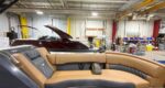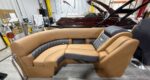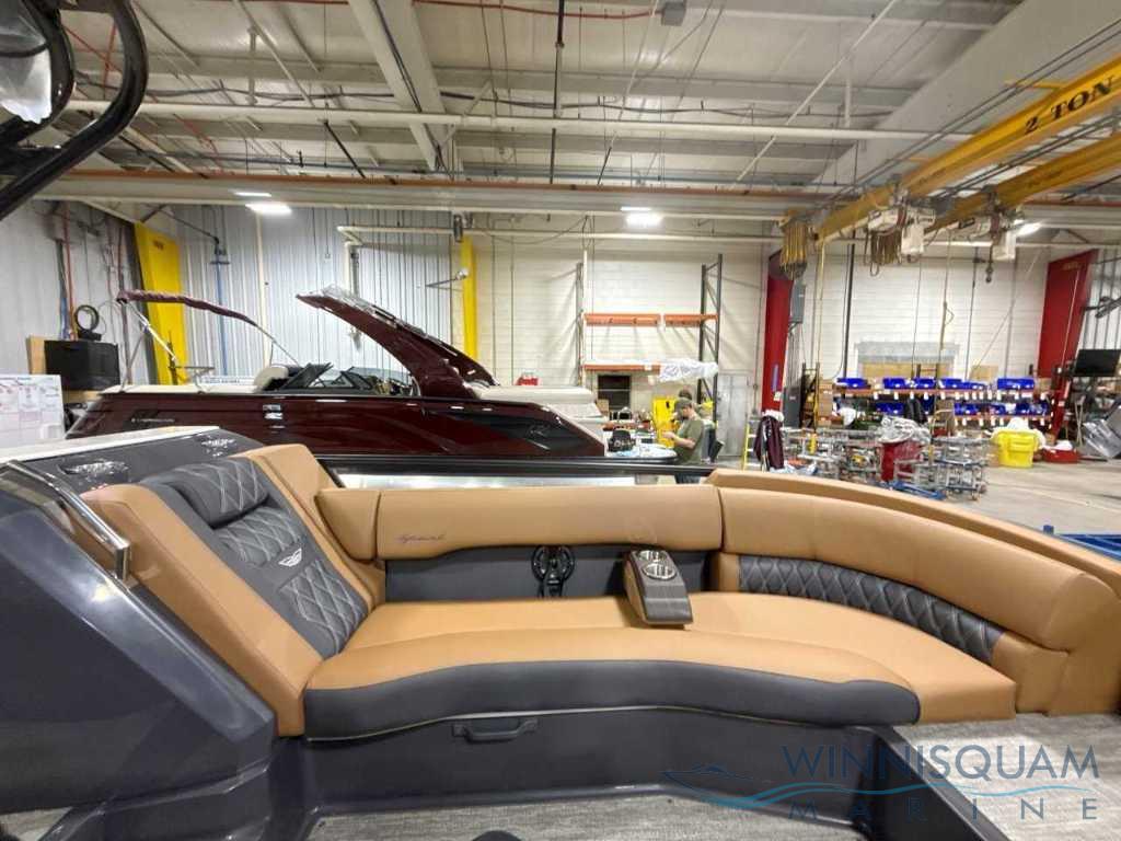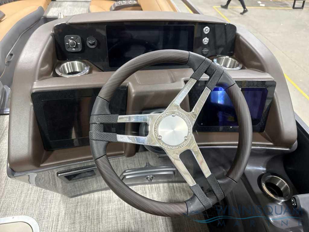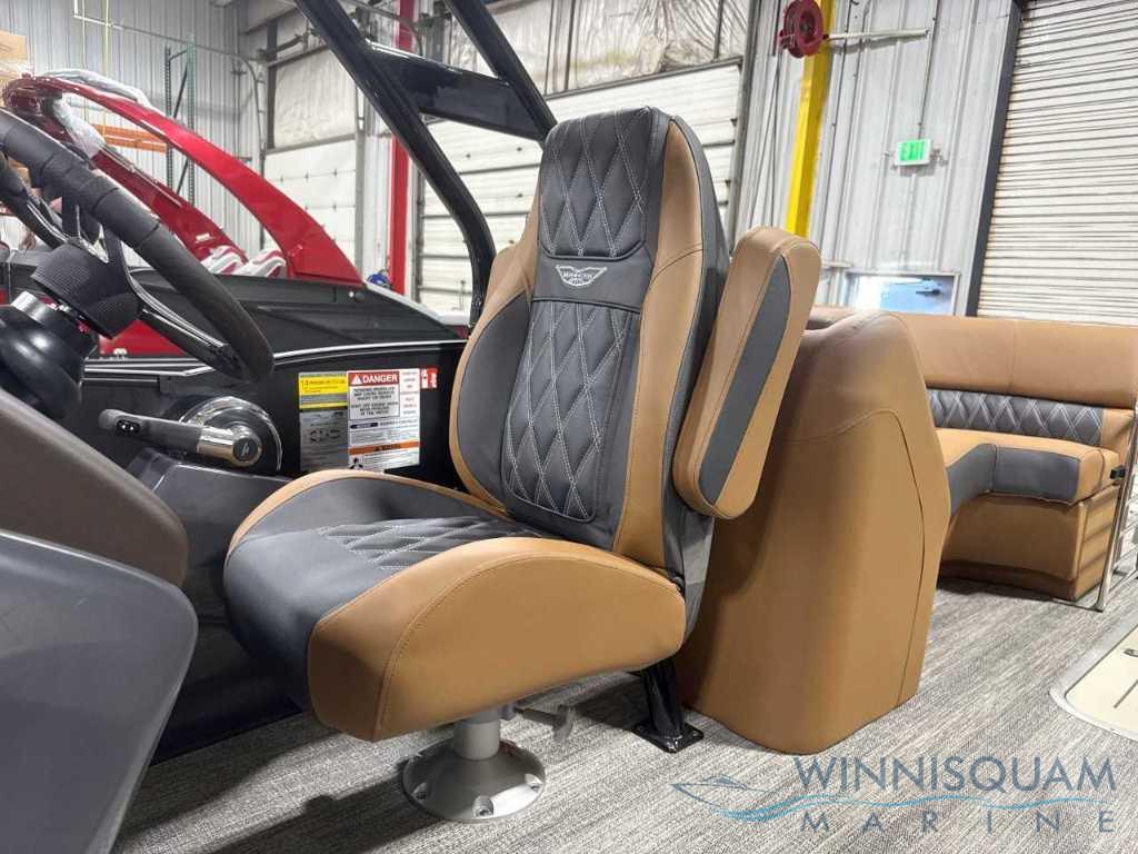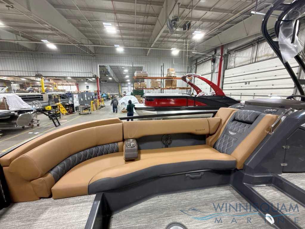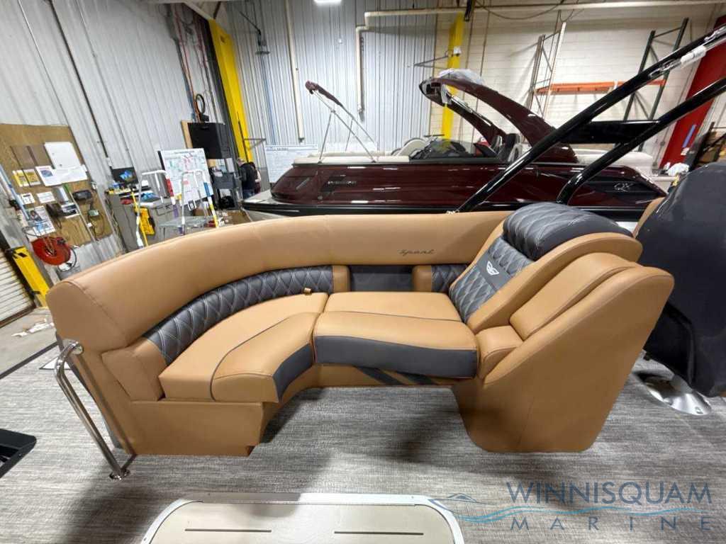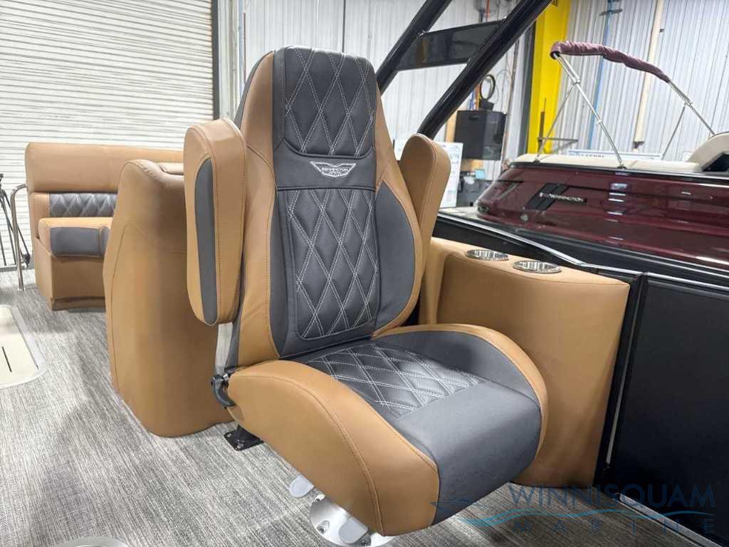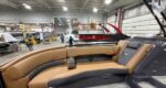 NEW Modesto Brown Veneto Vinyl Interior - Now available in the Bennington Bowrider - 25 Foot R-Series Fast-Back Layout with a Tubular Arch. Powered by a Mercury 300 V8!!