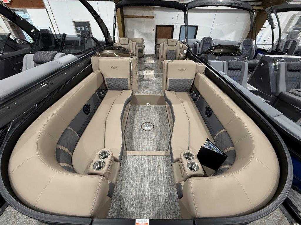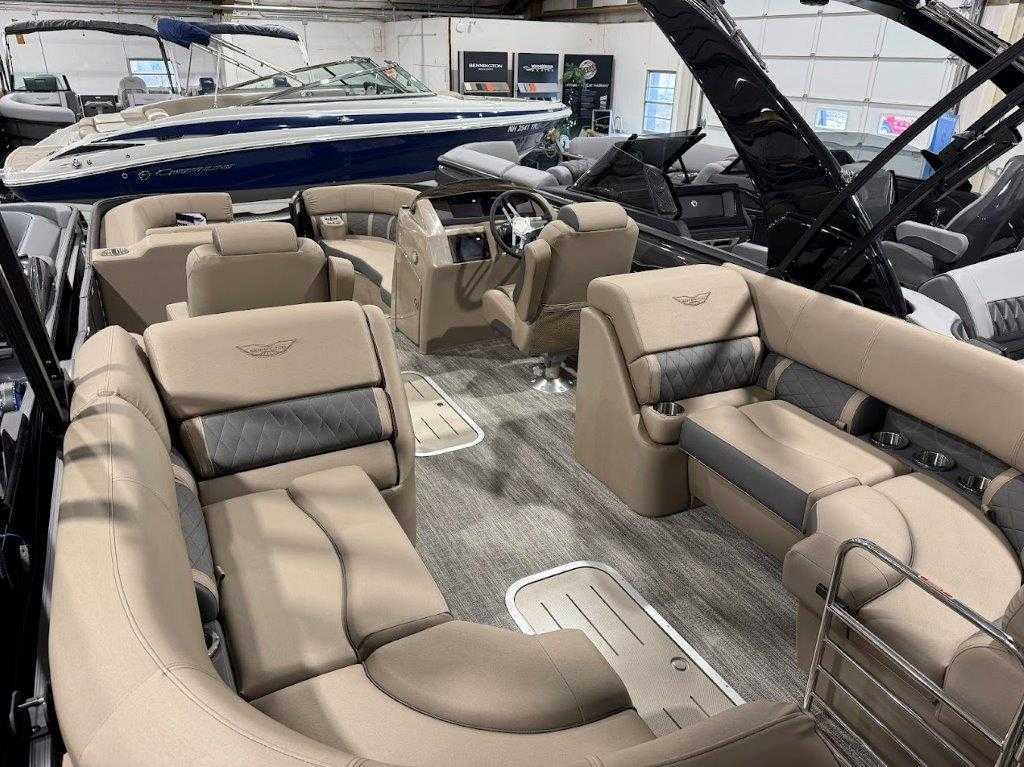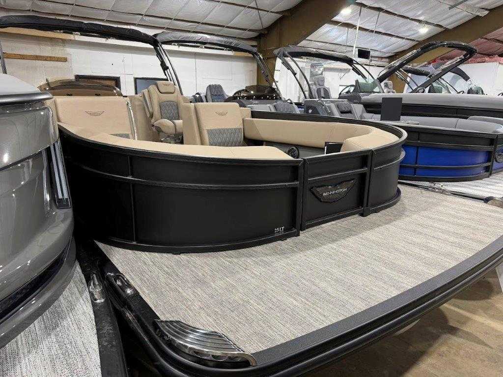 Command the water 2026 Bennington 25LTFB Blackout: Mercury 200HP Proxs power, V-Hull performance, 67-gal fuel, fiberglass console with 7" Simrad/Vivid display, premium Rockford Fosgate audio, four chaise lounges and luxe helm